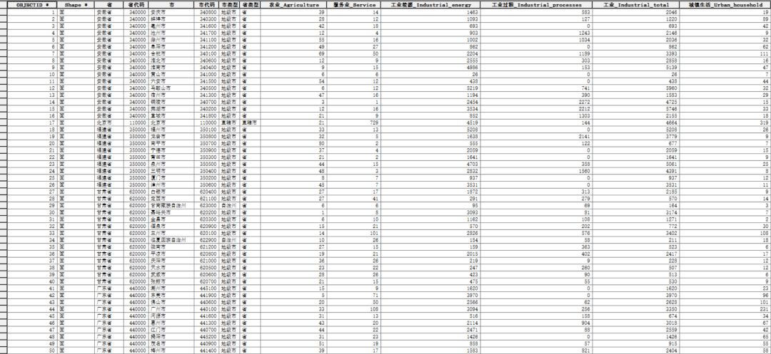 我们先来看一下官方提供的Excel格式的数据,四个年份的数据内容一致,只是年份不同!我们以2020年的数据为例来看一下!二氧化碳排放数据包括如下指标:农业、服务业、工业能源、工业过程、工业、城镇生活、农村生活、生活、道路、铁路、水运、航空、交通、能源、间接排放、直接排放、总排放、人均排放、单位总GDP二氧化碳排放。数据单位为:万吨。