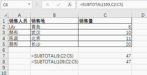 大家看完这个案例后,明白了吗? 参数为109,表示 subtotal不统计手动隐藏的行数据;9表示可以统计到手工隐藏的数据。