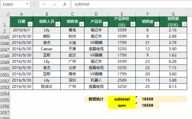 今天给大家推荐一个函数 subtotal函数,可以实现对筛选出的数据求和,计数,求最值等待~