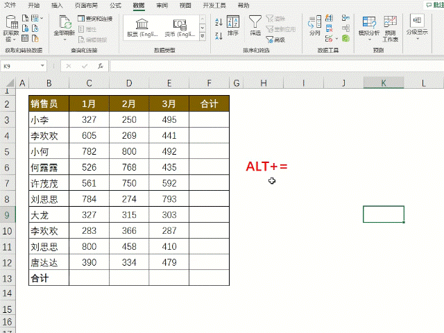 框选数据区域,按快捷键ALT+=快速求和,其实质就是在单元格中插入SUM函数。