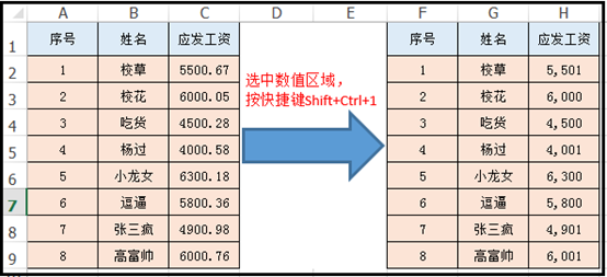 方法:选中数据区域,按快捷键Shift+Ctrl+1,小数立马四舍五入变整数。