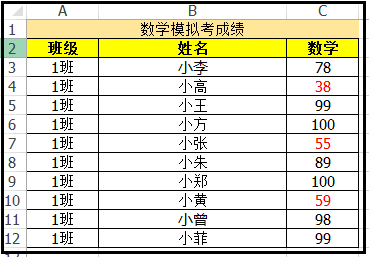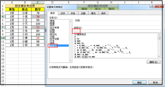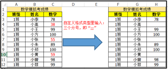 有时在做报表公开展示的时候,某些单元格的内容我们不想让人看到,就要把单元格的内容隐藏起来。如下图,要把分数为不及格的单元格内容隐藏起来,要怎么操作?