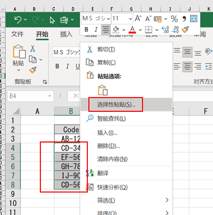 5、选中单元格B4:B8,然后点击右键并选择“选择性粘贴”