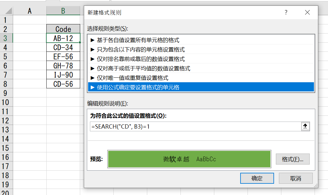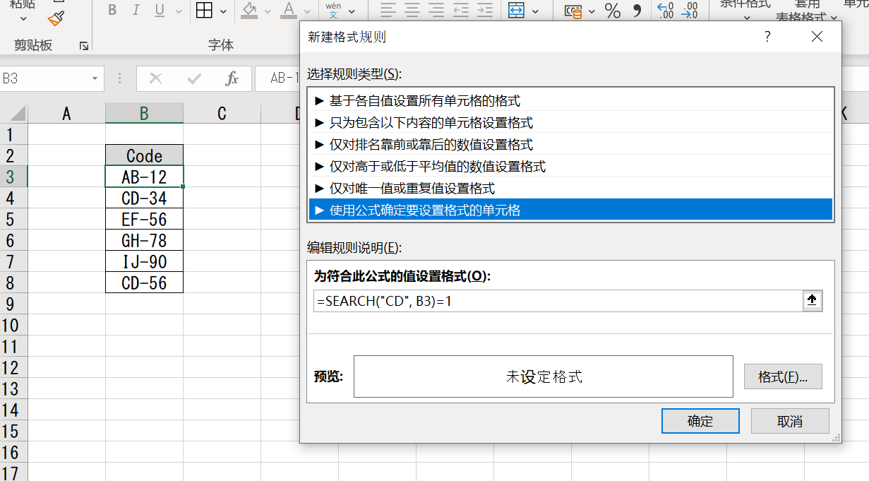 2、选中“使用公式确定要设置格式的单元格”,然后在下面输入公式“=SEARCH("CD", B3)=1”