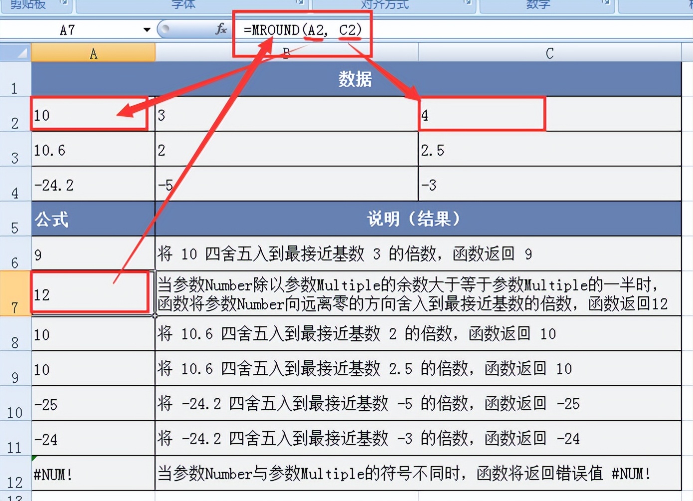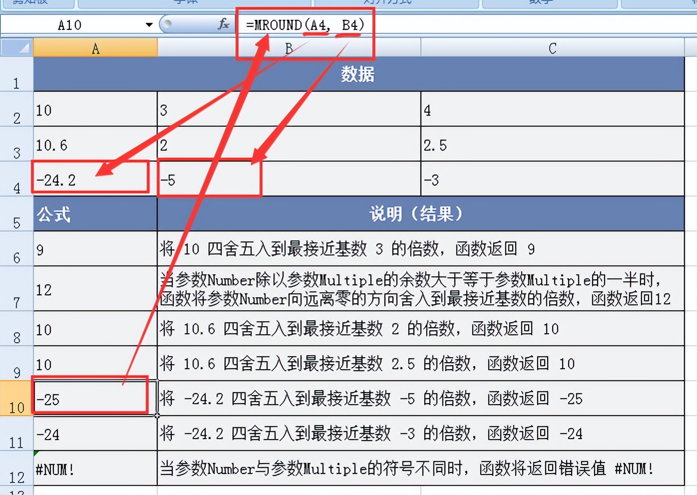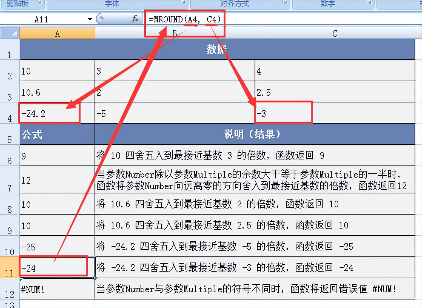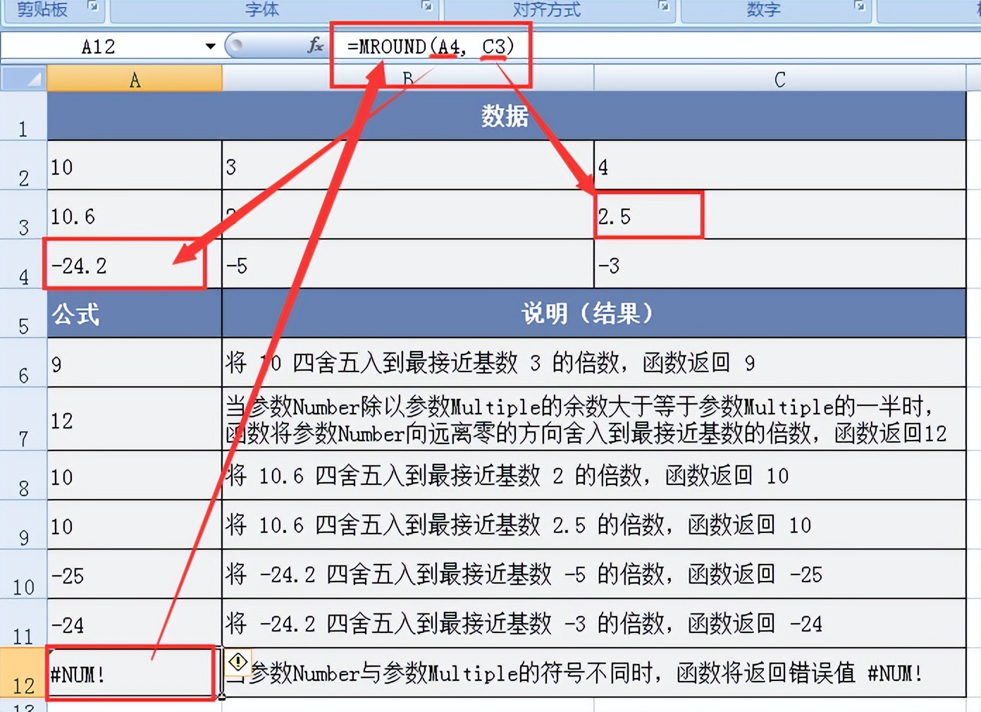 2、当参数Number与参数Multiple的符号不同时,函数将返回错误值 #NUM!。