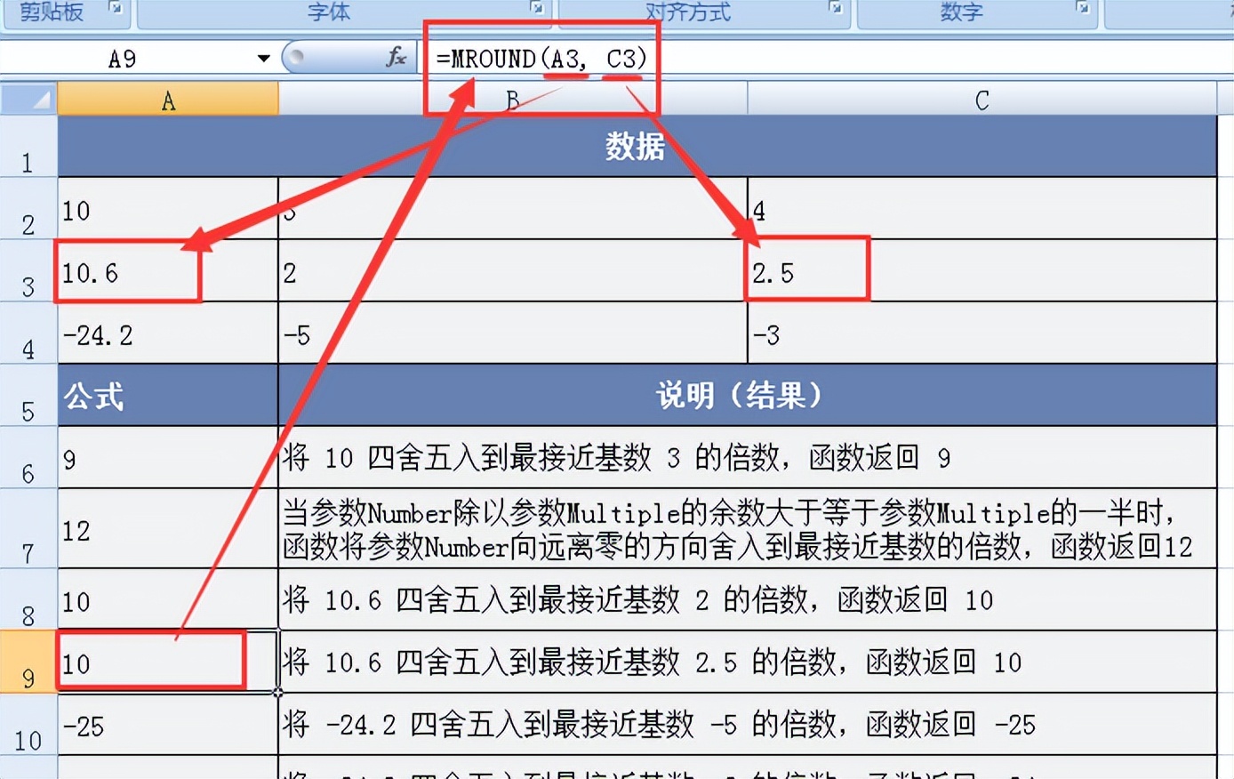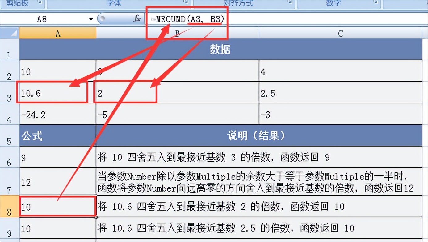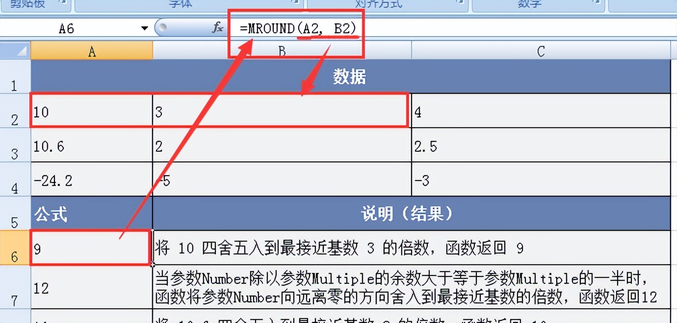 图例2:当参数Number除以参数Multiple的余数大于等于参数Multiple的一半时,函数将参数Number向远离零的方向舍入到最接近基数的倍数