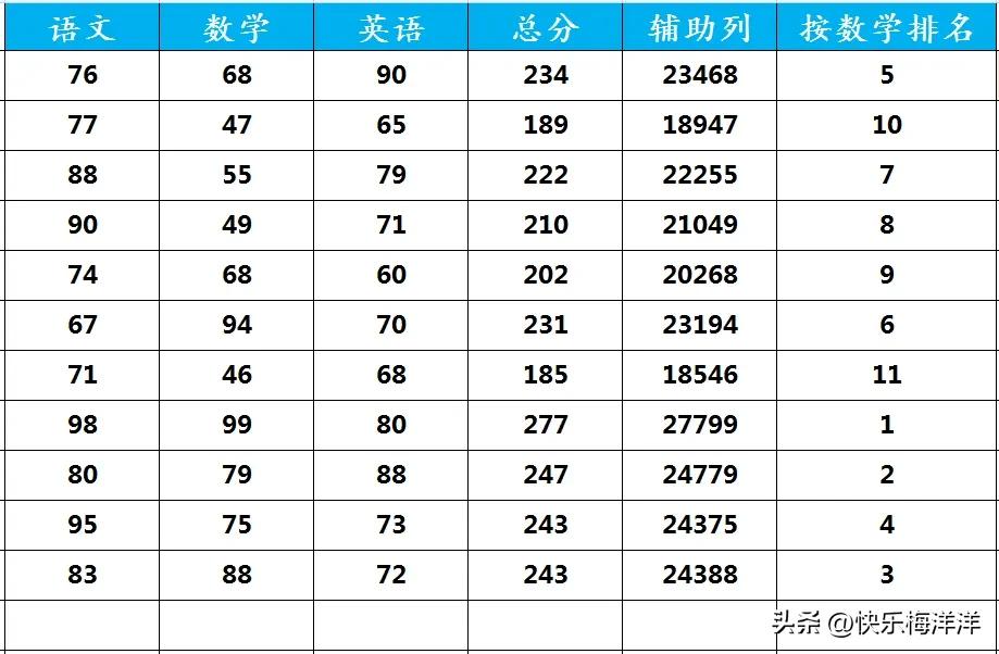 要排列的数据如果相同,可以建辅助列(如=E2*100+C2),将数据扩大倍数(100倍)加上需要排序的条件数据(如数学成绩),然后通过辅助列排序。