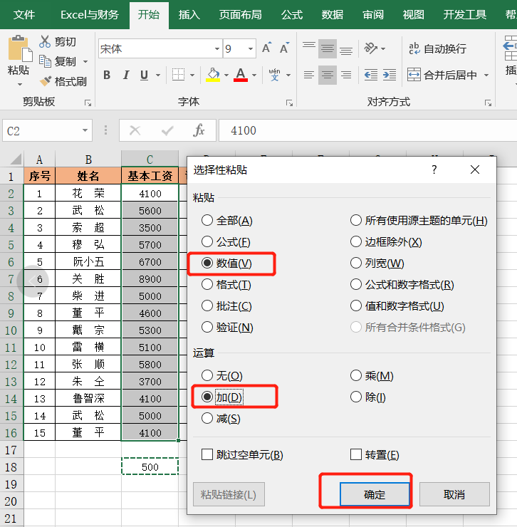 工资表制作完成后,老板说要加工资,全部上调500。怎么办?难道又要重新录入吗?其实不需要,我们可以先在任意一空白单元格内容输入"500",然后将其复制一下。再选择所有需要上调工资的数据区域,鼠标右键-【选择性粘贴】,在【运算】中选择【加】即可一次上调所有工资。