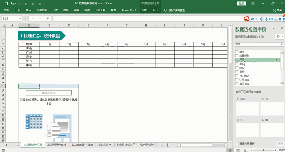 选中数据源,建立数据透视表后。分别拖动【城市】【月份】字段到【行】【列】区间,最后拖动【销售价】到【值】区间,即可快速汇总统计数据。
