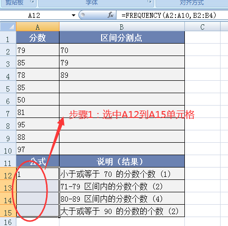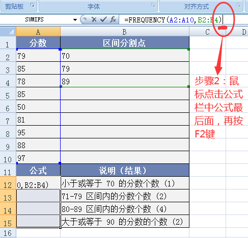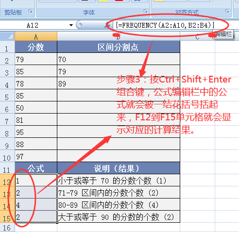 - 在选择了用于显示返回的分布结果的相邻单元格区域后,函数 FREQUENCY 应以数组公式的形式输入。