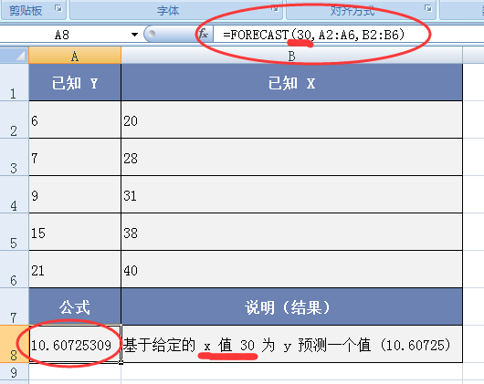 根据已有的数值计算或预测未来值。此预测值为基于给定的 x 值推导出的 y 值。已知的数值为已有的 x 值和 y 值,再利用线性回归对新值进行预测。可以使用该函数对未来销售额、库存需求或消费趋势进行预测。