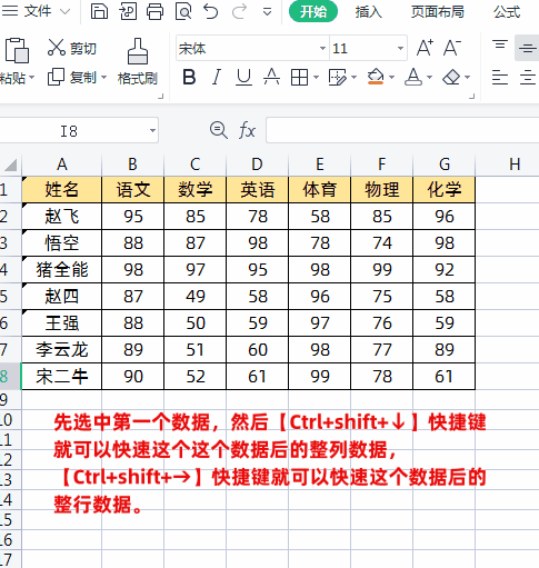 有时我们需要选中整行或者整列数据,使用者两个快捷键可以快速选择,我们需要先选中第一个数据,然后【Ctrl+shift+↓】快捷键就可以快速这个这个数据后的整列数据,【Ctrl+shift+→】快捷键就可以快速这个这个数据后的整行数据。
