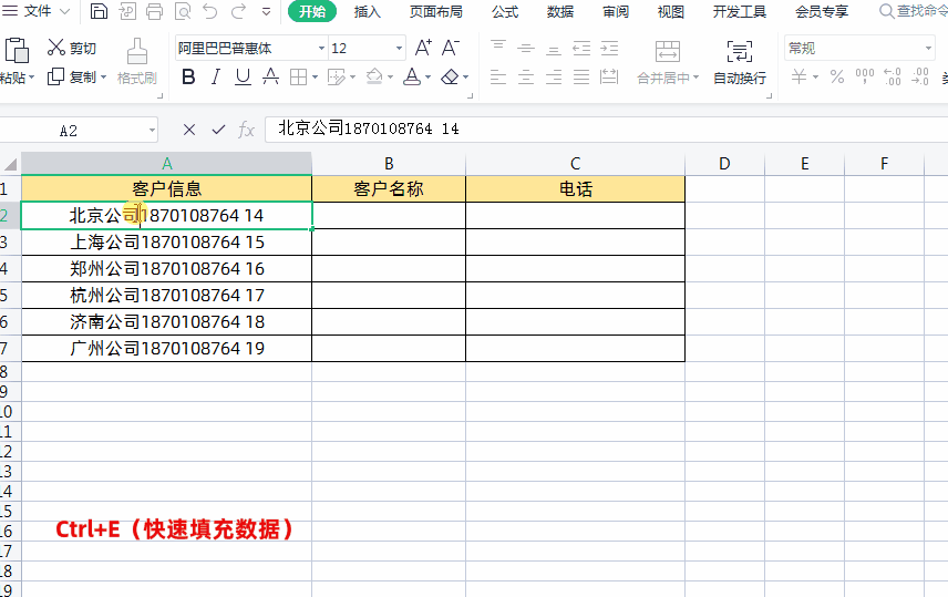 【Ctrl+E】组合键它的作用很多,可以通过对比字符串关系,识别出其中规律,然后实现快速填充,实现批量添加前后缀、快速提取字符、整理数据、合并拆分单元格、分段数据等功能。之前跟大家分享过它的7种高效用法,感兴趣的朋友可以看一下。如下图所示首先先输入一个要拆分的示例,然后选取它和下面的空行(也可以只选取下面的第一个空格)最后按一下快捷键【Ctrl+E】就可以快速拆分填充数据了。