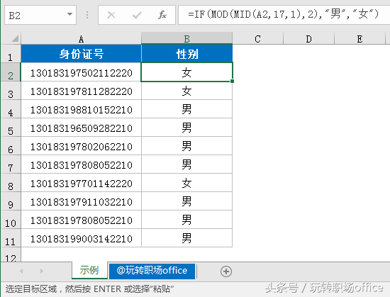 =IF(MOD(MID(A2,17,1),2),"男","女")