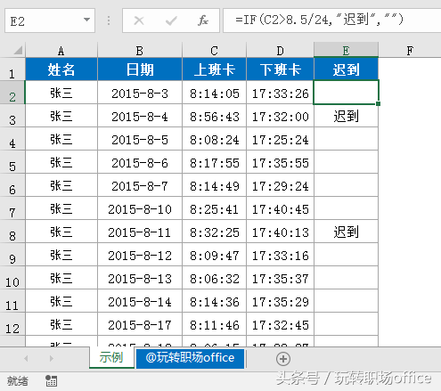 =IF(C2>8.5/24,"迟到","")