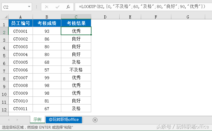 =LOOKUP(B2,{0,"不及格";60,"及格";80,"良好";90,"优秀"})