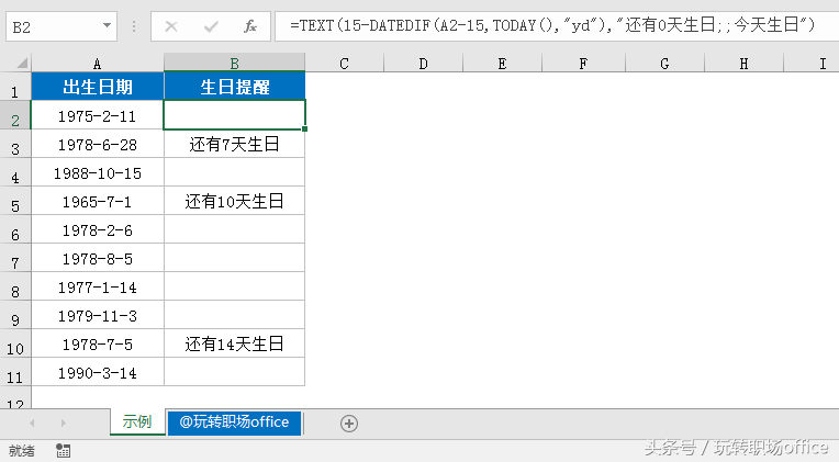 =TEXT(15-DATEDIF(A2-15,TODAY(),"yd"),"还有0天生日;;今天生日")