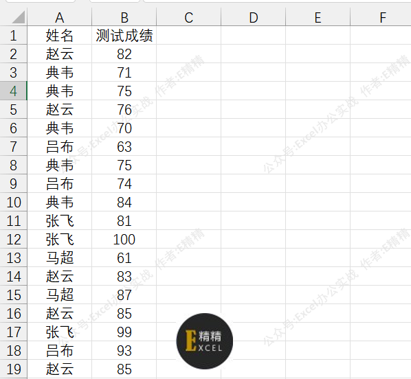 の数据源说明:是一份6位同学的测试成绩,从上往下记录每一次每个人的成绩!