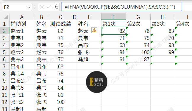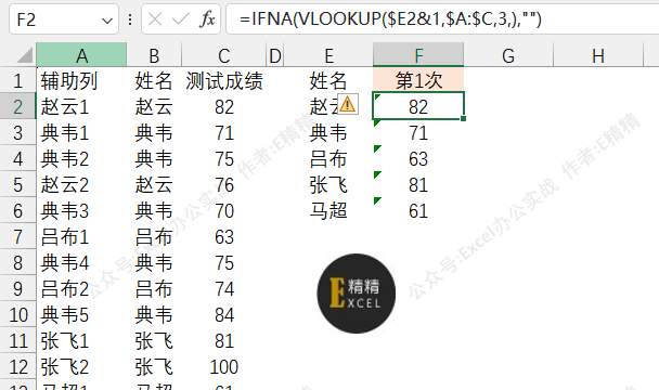 比如第一次成绩!当然第一次VLOOKUP不加辅助列也可以实现,这里更多的想告诉大家,需要哪一次直接修改后面的数字即可!$E2&1