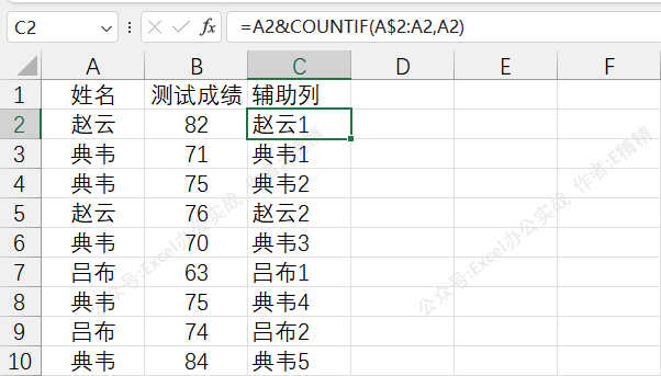 这条公式的意思是从上到下按出现的顺序给每个人编号,注意第一个A$2:A2 第一个A2的2前面有$
