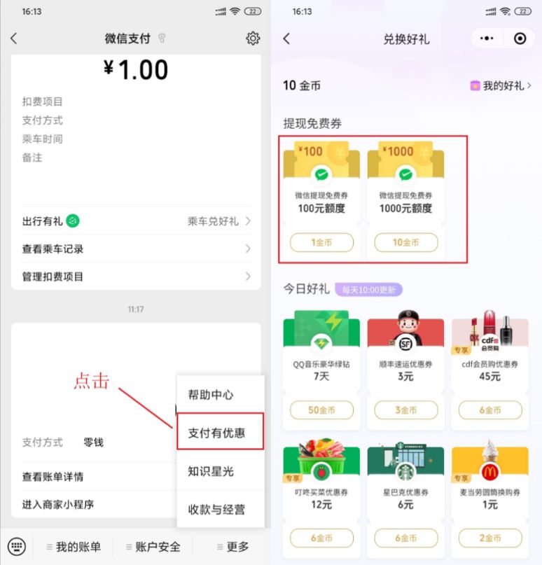 微信每次提现都是需要手续费的,在微信支付中找到【支付有优惠】,进入里面领取金币,之后点击【兑换好礼】,就可以用金币来换提现额度了。