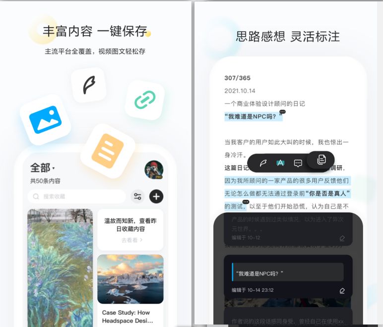 这是一个可以收藏多个平台文章、视频、音频的工具,看见喜欢的文章段落,用它收藏保存喜欢的内容,以后就不需要来回切换软件寻找想要的内容啦。