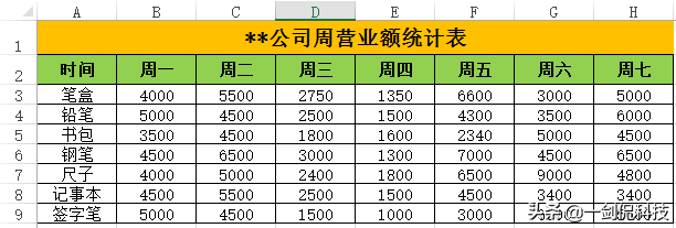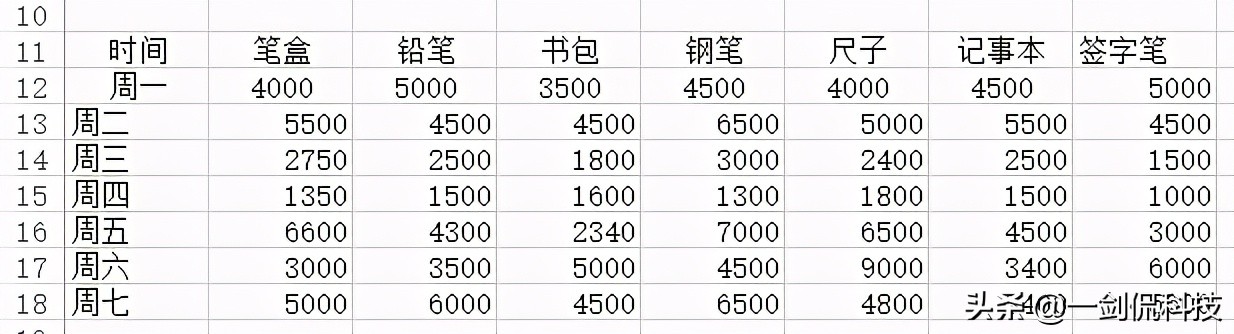 如下表所示,这是公司的周营业额,现在为了处理数据的需要,需将时间和产品进行转置。