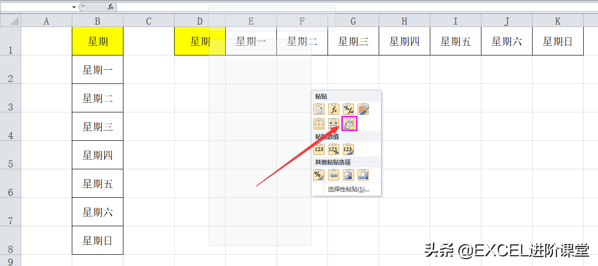 如下图所示,需要将星期从列变到行方向,只需要复制列方向的数据后,粘贴时选择转置即可。
