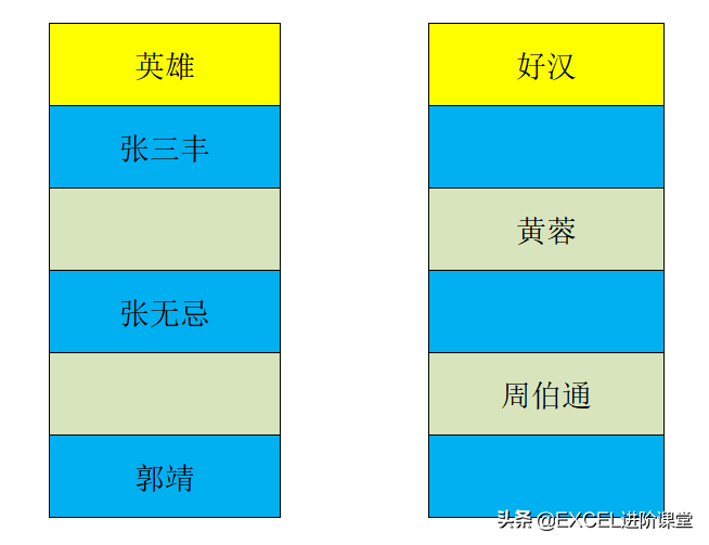现在想把“好汉”里面的内容与“英雄”进行合并,也就是说所有的姓名都放在“英雄”这一列当中。观察一下,好汉这一列当中,凡是有空格的都不能直接复制过来,否则会将英雄这一列原有的姓名给覆盖掉。那么,可不可以粘贴的时候,将好汉列当中所有为空格的单元格跳开不复制呢?当然可以,粘贴其实已经为你想到了。