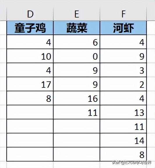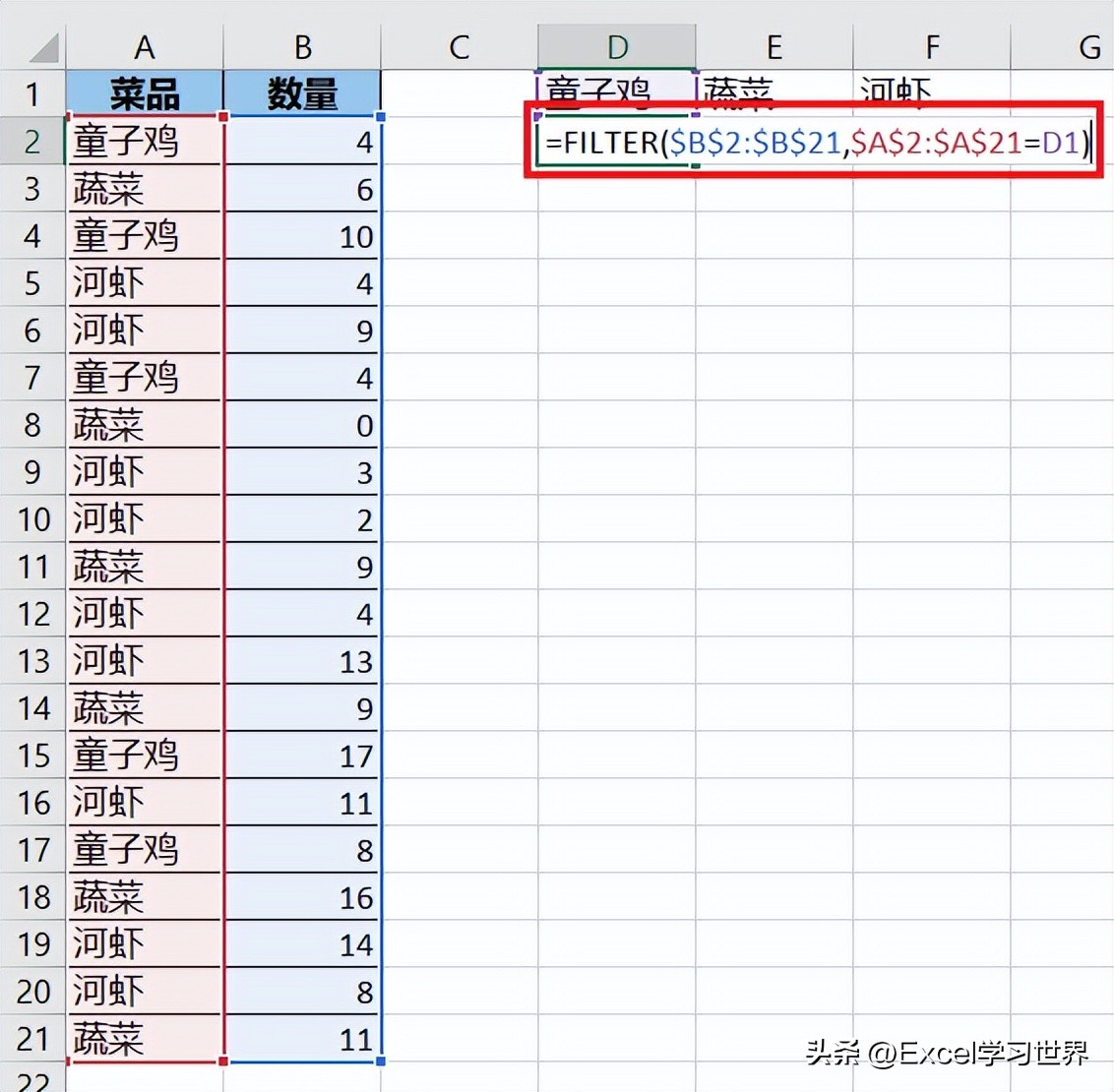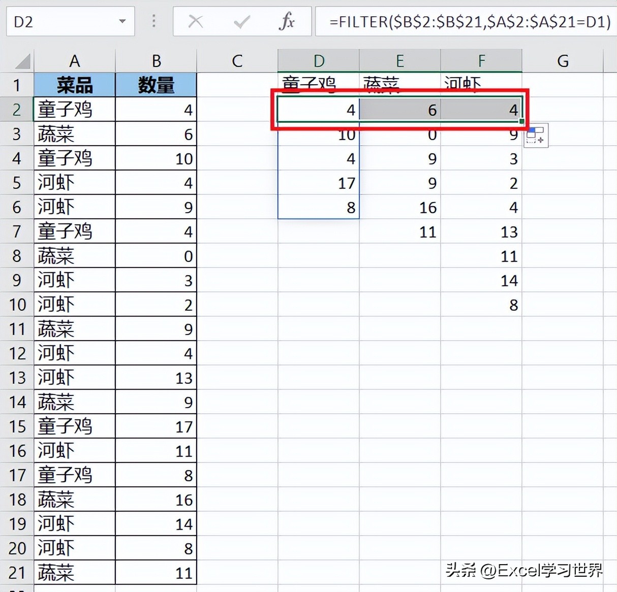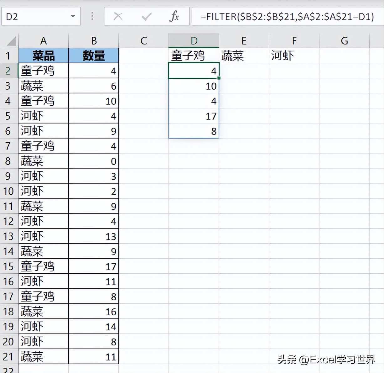 - 本案例公式表示如果 A 列的菜品与 D1 标题相同,则筛选出 B 对应区域中的值