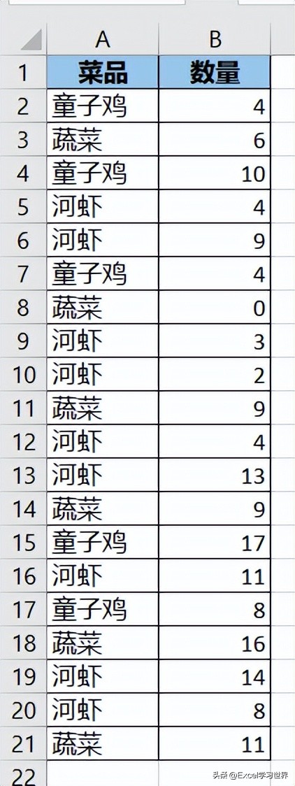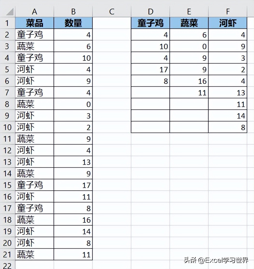 将下图 1 的数据表按菜品转置成二维表,每个菜品下的数量纵向列出,不要加总。