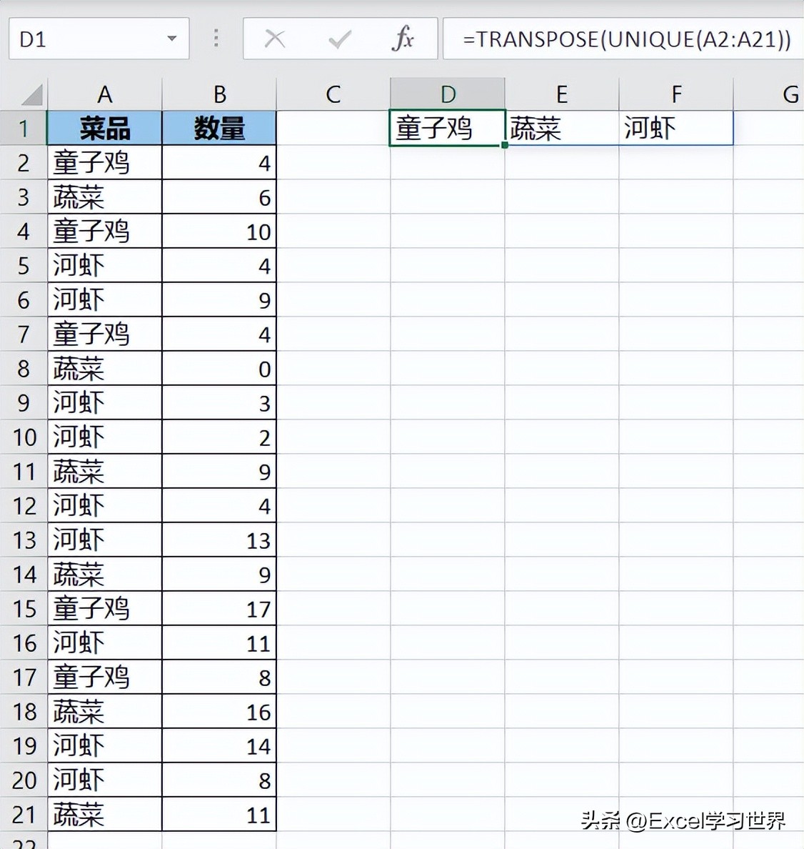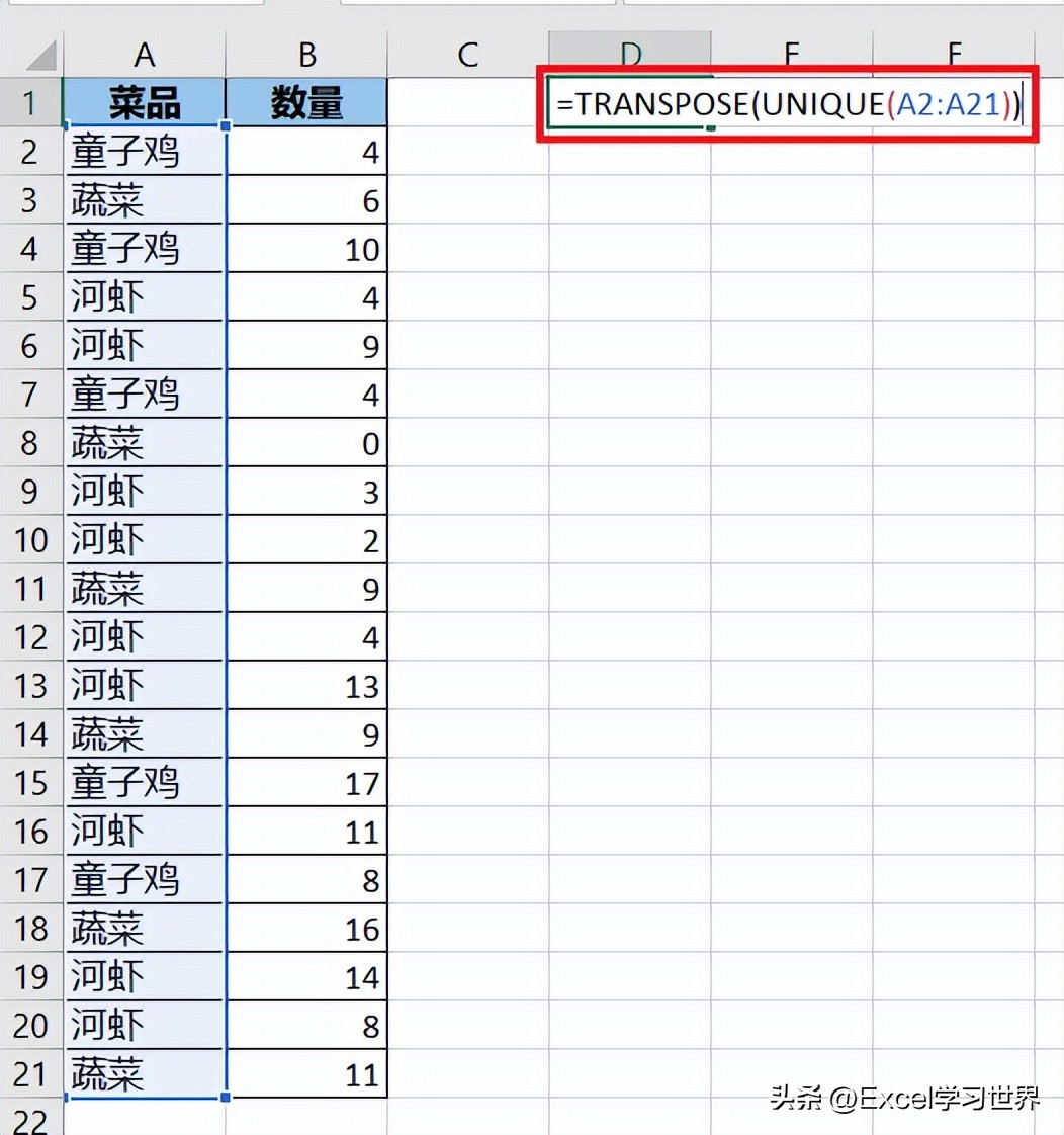 - 这段公式最终会将 A 列的菜品去重,输出一列唯一值;