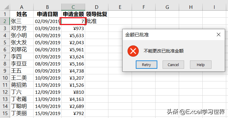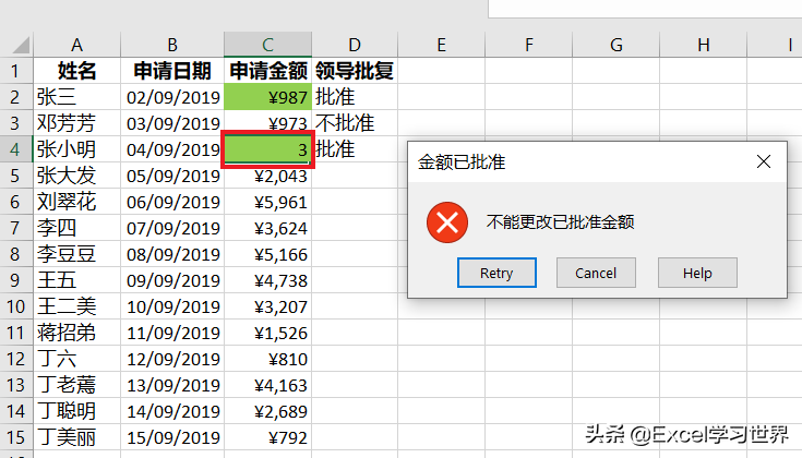 此时,当 D 列为“批准”时,试图更改 C 列的金额,就会弹出以下出错警告框,无法进行修改。