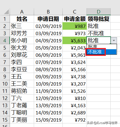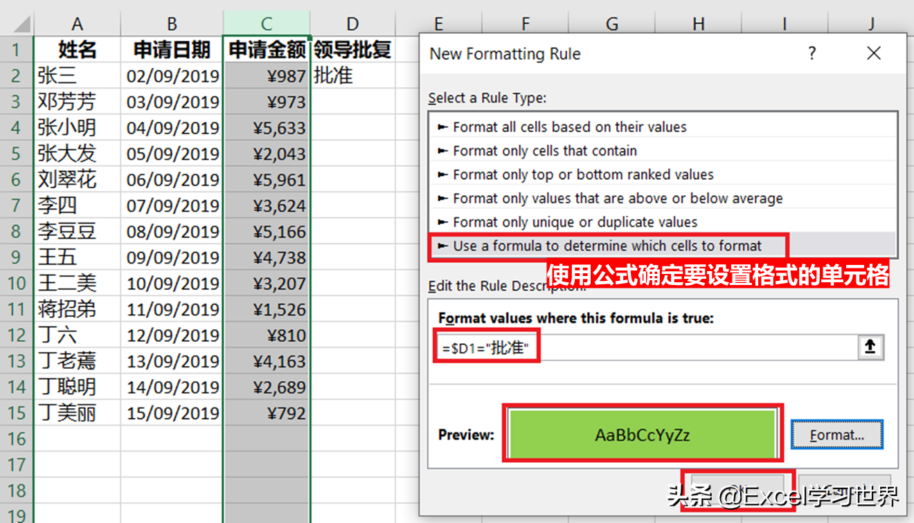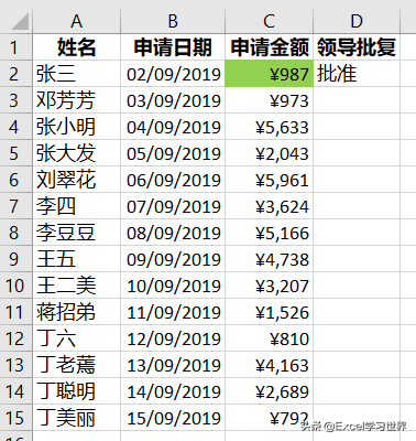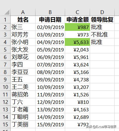 接下来设置如下效果:当 D 列为“批准”时,C 列的相应单元格高亮显示为绿色。