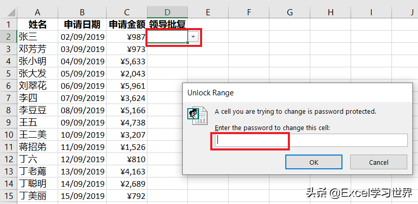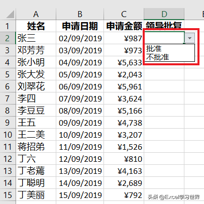 • 只有掌握密码的领导可以在 D 列通过下拉菜单选择是否批准申请金额