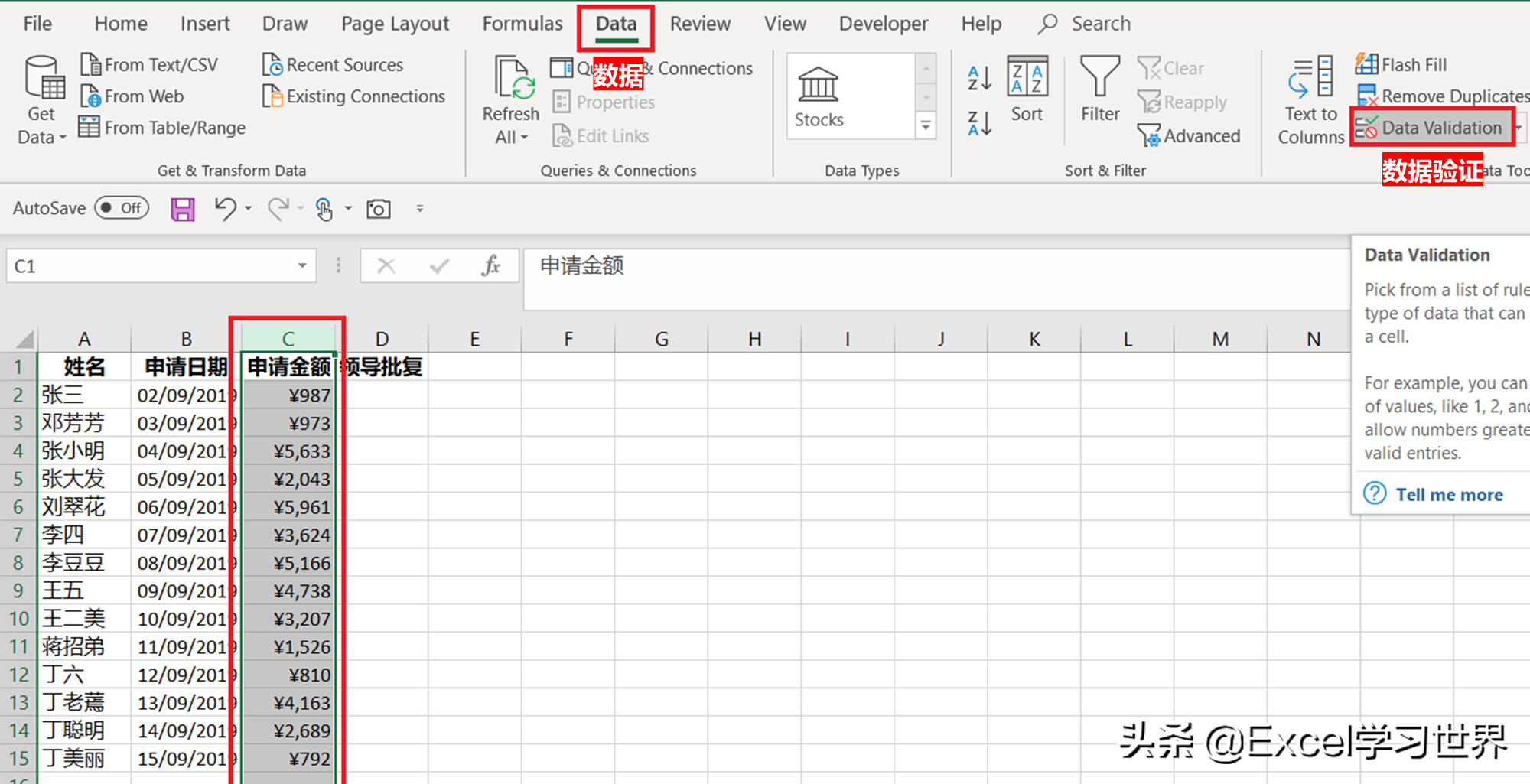3. 选中 C 列 --> 选择菜单栏的“数据”-->“数据验证”