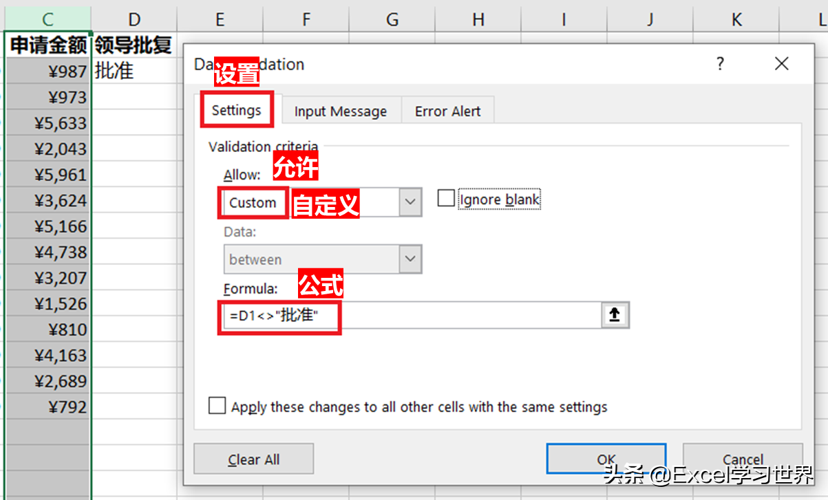 接下来进行如下设置:当 D 列为“批准”时,C 列的金额就不允许再更改。