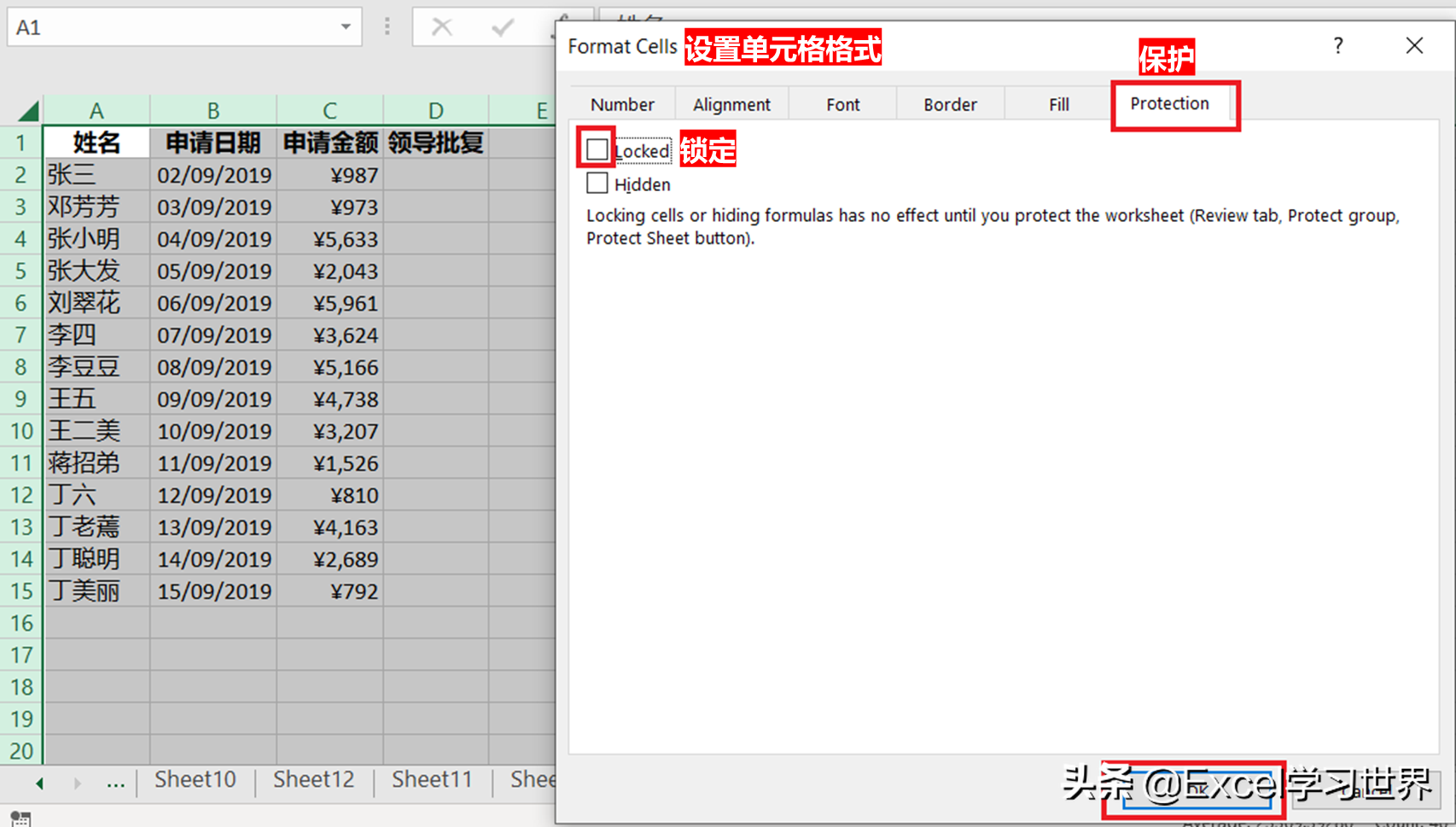 8. 全选整个工作表 --> 按 Ctrl+1,在弹出的“设置单元格格式”对话框中选择“保护”选项卡 --> 取消选择“锁定”--> 点击“确定”