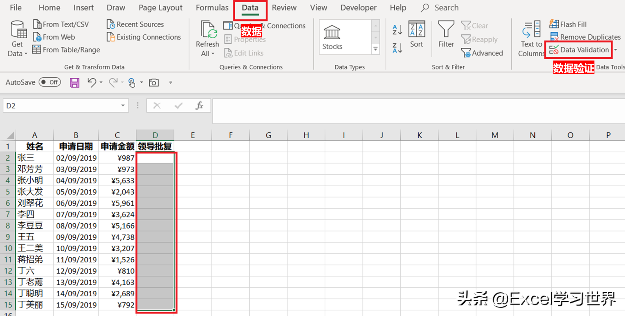 1. 制作“领导批复”下拉菜单:在 D1 单元格输入标题 --> 选中 D 列的数据区域 --> 选择菜单栏的“数据”-->“数据验证”