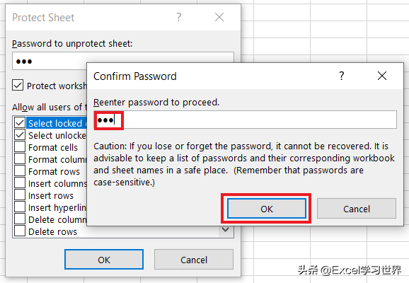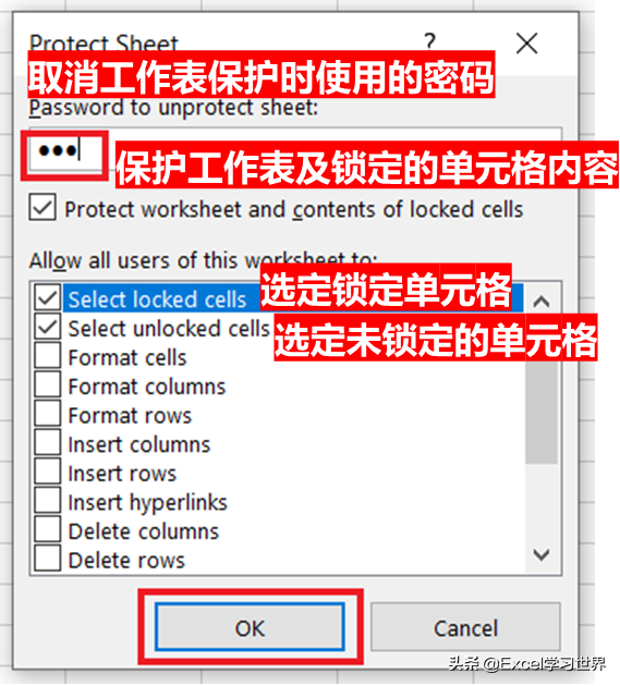 • 取消工作表保护时使用的密码:输入密码
