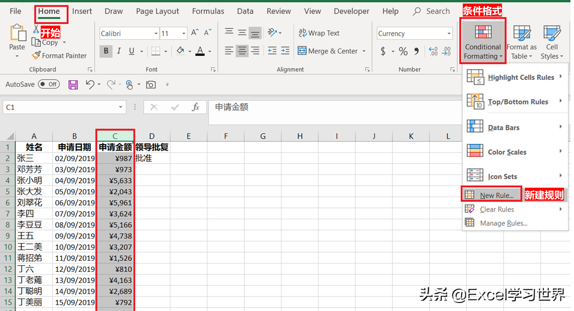 6. 选中 C 列 --> 选择菜单栏的“开始”-->“条件格式”-->“新建规则”