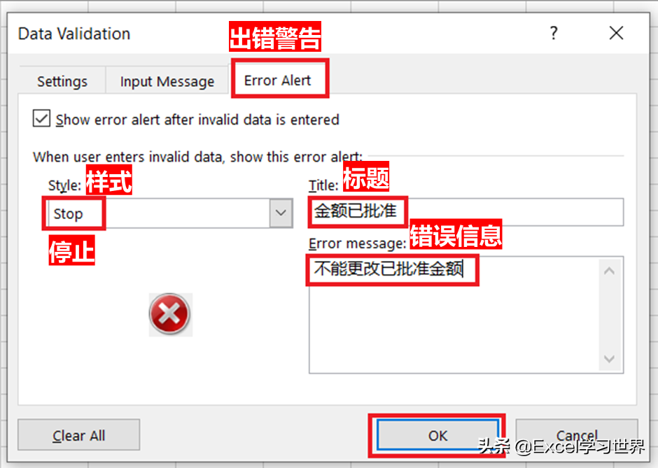 5. 选择“出错警告”选项卡,进行如下设置 --> 点击“确认”按钮: