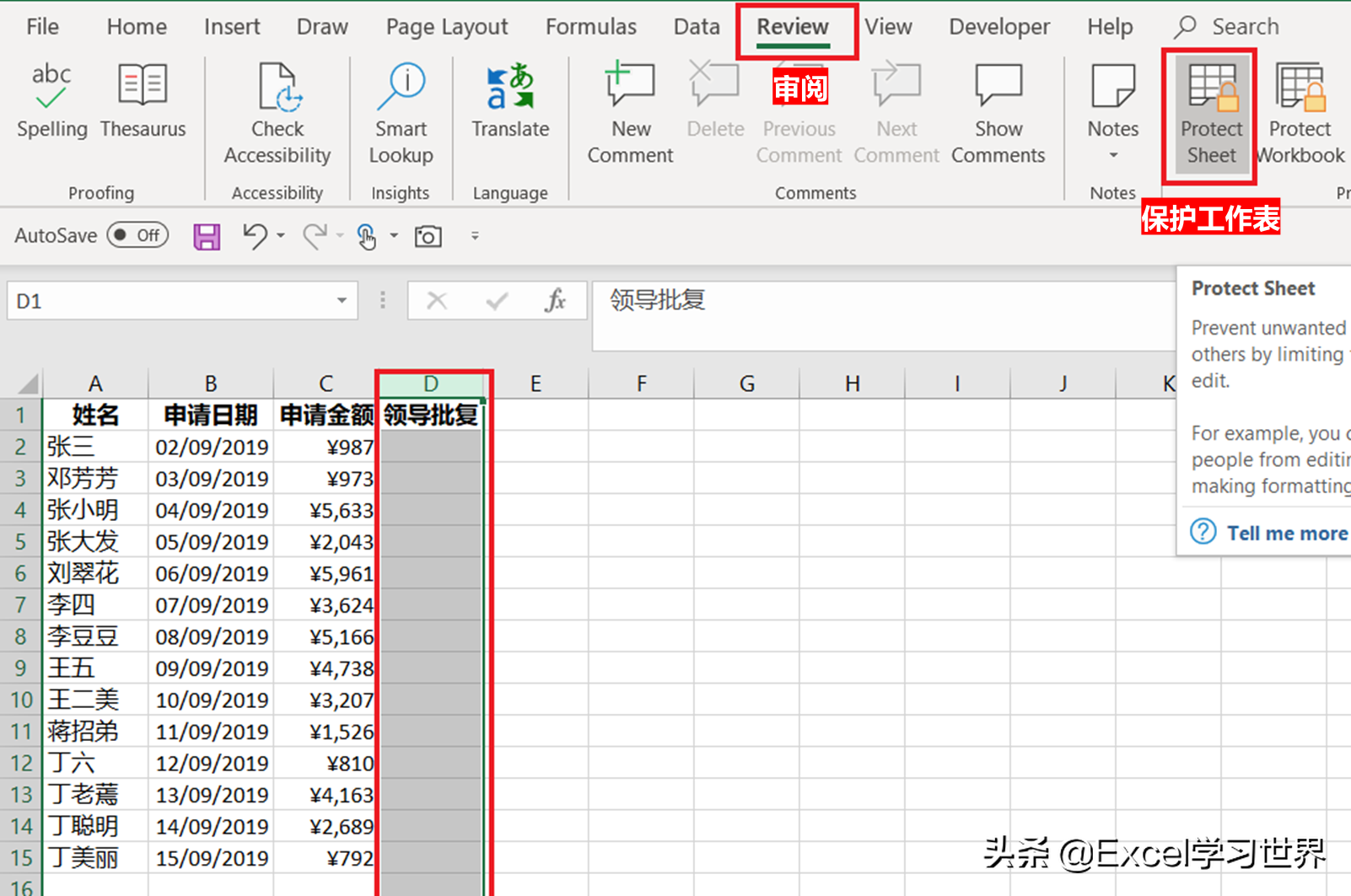 9. 选中 D 列 --> 选择菜单栏的“审阅”-->“保护工作表”