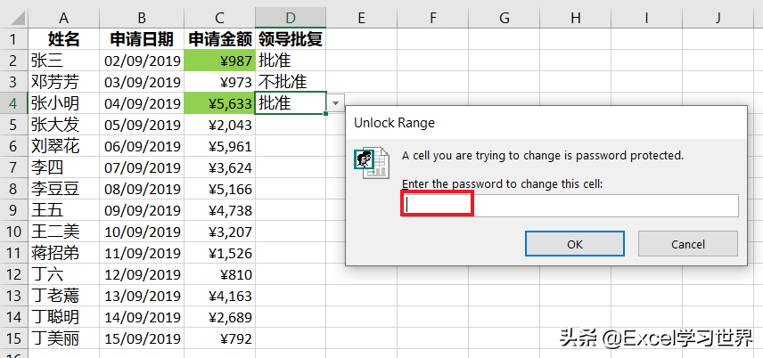 - 只有掌握密码的领导可以在 D 列通过下拉菜单选择是否批准申请金额