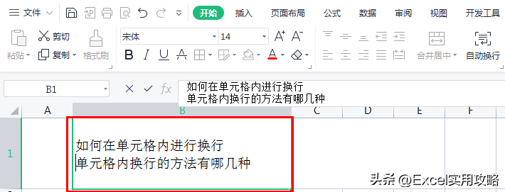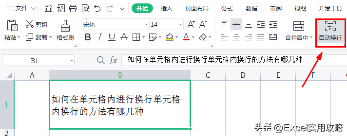 Alt+Enter快速换行,鼠标光标选中B1单元格内要换行的文字前,按下Alt+Enter组合键,就可以实现单元格内文字换行了。