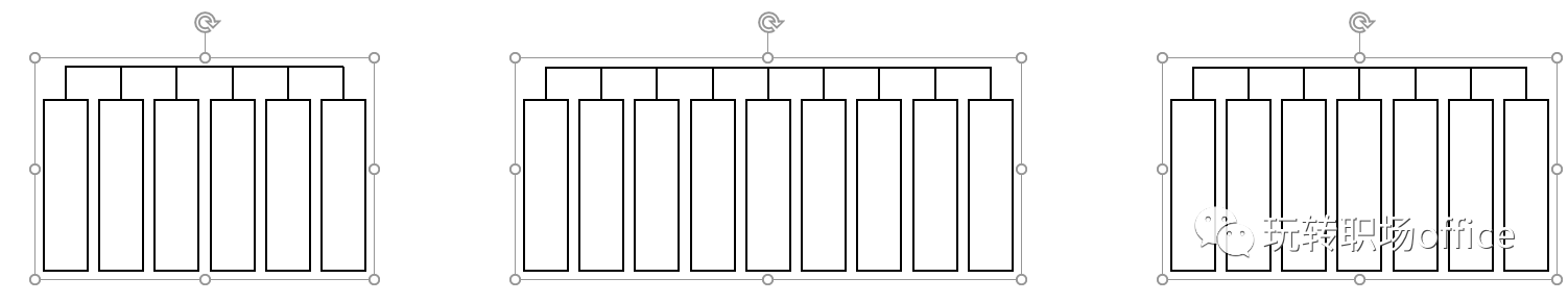 1-10 分别画三条直线,与三个组合图形顶端的直线连接起来,设置直线黑色边框,1.5磅。直线与组合图形设置对齐方式为顶端对齐。分别将直线与组合图形再组合起来。