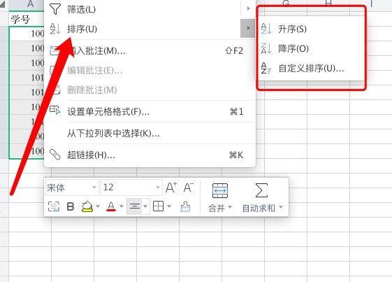 第四步,点击右键“排序”或者直接选中工具栏“排序”,对总分进行排序;