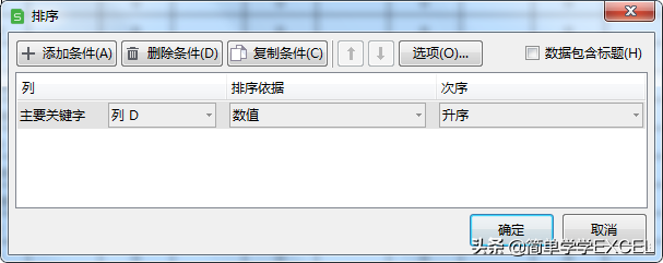 语句释义:range(“a2:d11”)是要参与排序的数据区域;Sort后面有个空格(VBA的提示中有括号,实际不需要,文尾会写原因),然后接参数。第1参数Key1为range(“b2”),表示按“B列”排序的关键字(这里B3,B4都可以,只要在数据区域内),作用等同于下图的“列D"。