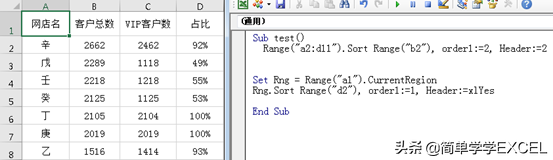Order1:=2表示降序(英文全写xlDescending),省略不写的话默认为升序,就是上图中的"次序";Order的值 为xlAscending 表示”升序“(数字简写 1),几个Order是一样的。
