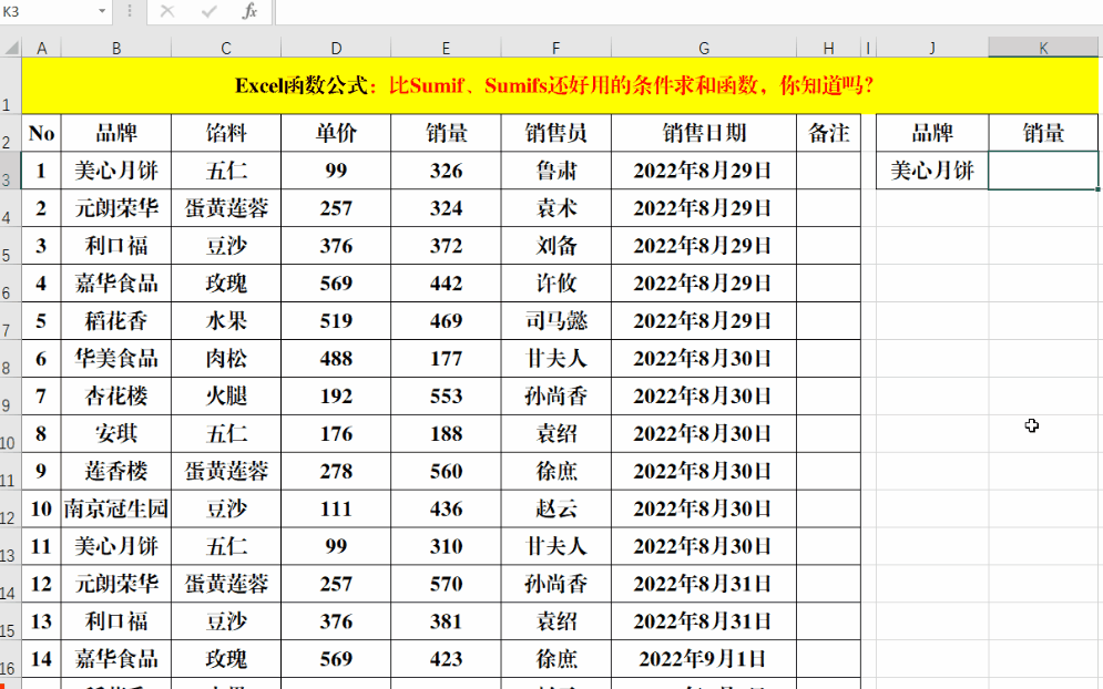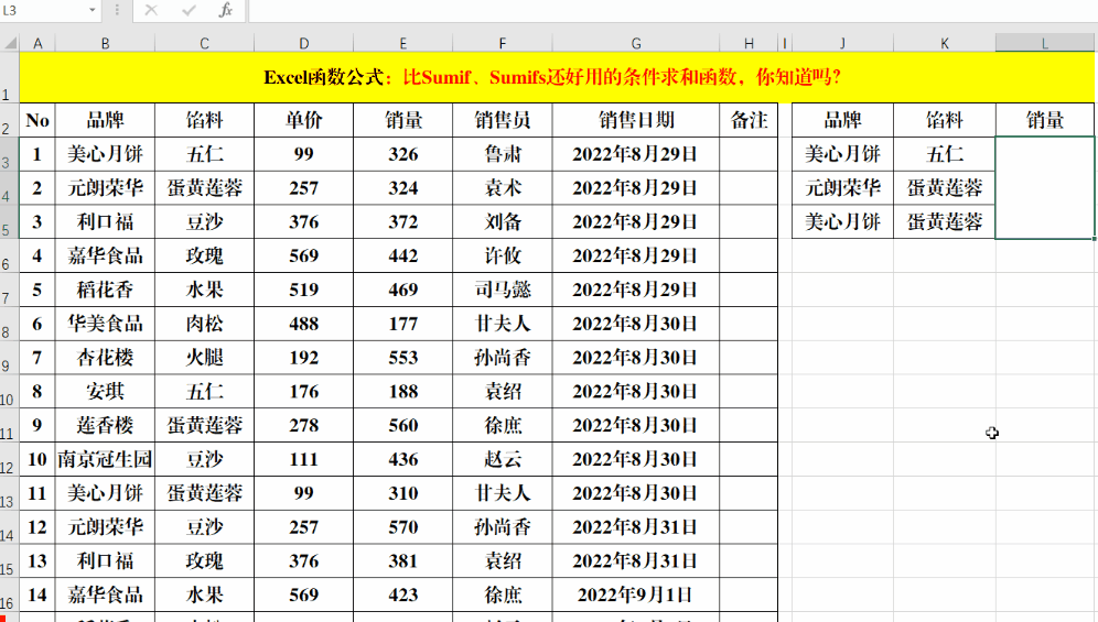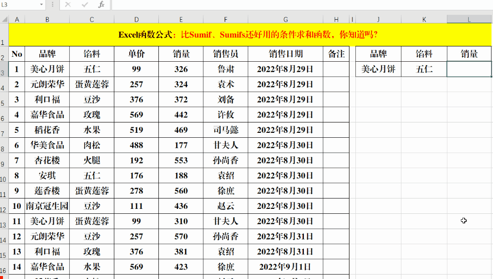 目的:计算指定“品牌”和“馅料”的总销量。